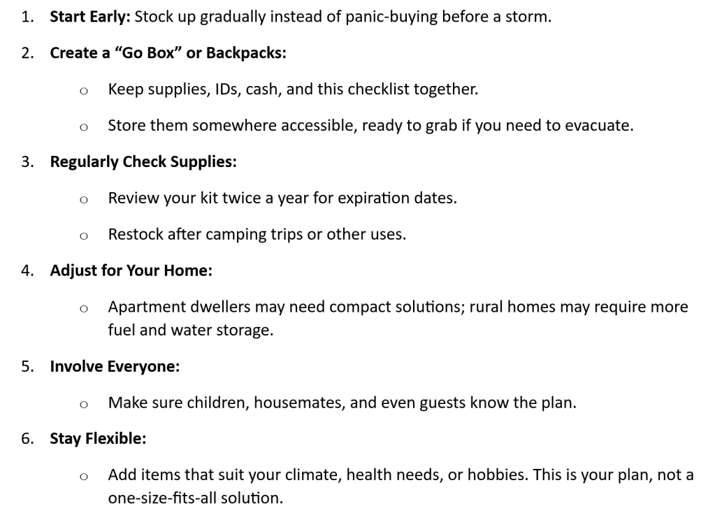 Small steps today mean you’ll face whatever storms come next with confidence. Instead of scrambling, you’ll know exactly where your supplies are, how to reach loved ones, and how to ride out a few days off the grid safely.