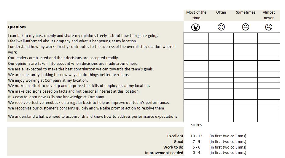 - Don’t make this the ONLY tool you use to determine how happy your employees are. There are some very affordable and good tools available to drive a more in-depth look at your company culture or employee engagement. This is just for spotting any trends you may need to be aware of or take a look at.
