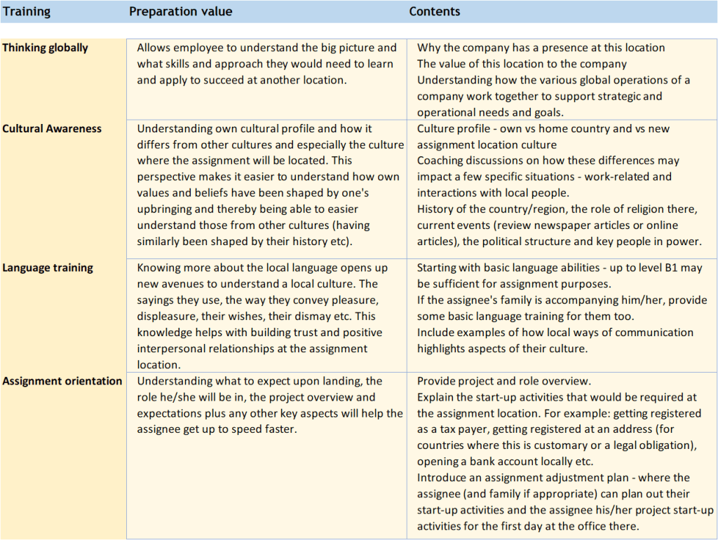 - Create or outsource a solid assignment preparation program for employees (and families as applicable). This includes cultural awareness training, language training (if applicable) and developing the right mindset and approach to living in a new country for a period of time.