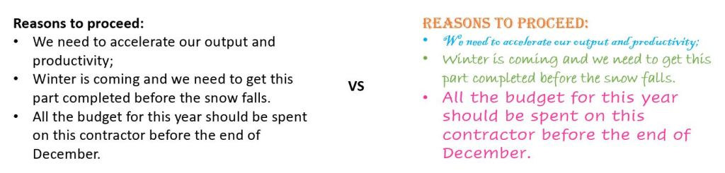 - Start working on the next level of detail – Consider that you may want to do a combination of training solutions like assigning some online training before they come to the workshop to cover some knowledge you want them all to have at the start of the workshop. Also, work out your bullet points into a “storyline” that logically structures the sequence of topics to be covered and exercises you will use to help build competency in using specific tools or approaches.
