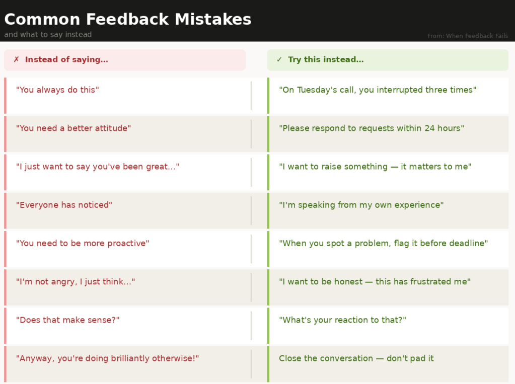 Vague observations, emotionally loaded language, and bad timing all guarantee a defensive response before you’ve finished your first sentence. The most common mistake is being clear in your head but vague when you say it out loud – telling someone they have a “bad attitude” is an interpretation, not an observation.. Feedback that can’t be described in concrete, observable terms isn’t ready to be given yet.