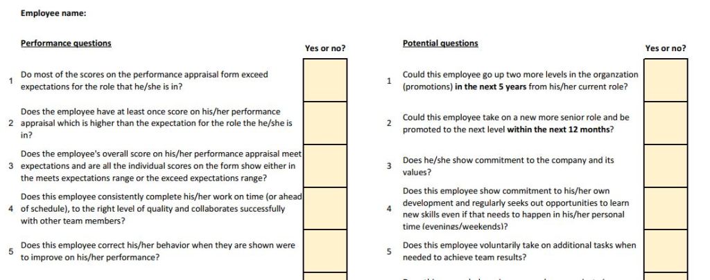 An easy checklist for employees and leaders is shown below – note how well they are performing in their current roles and then compare that to how much potential do they still have to move up a level or two in the company in the short to medium term.